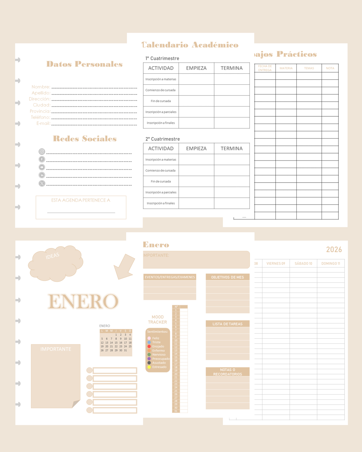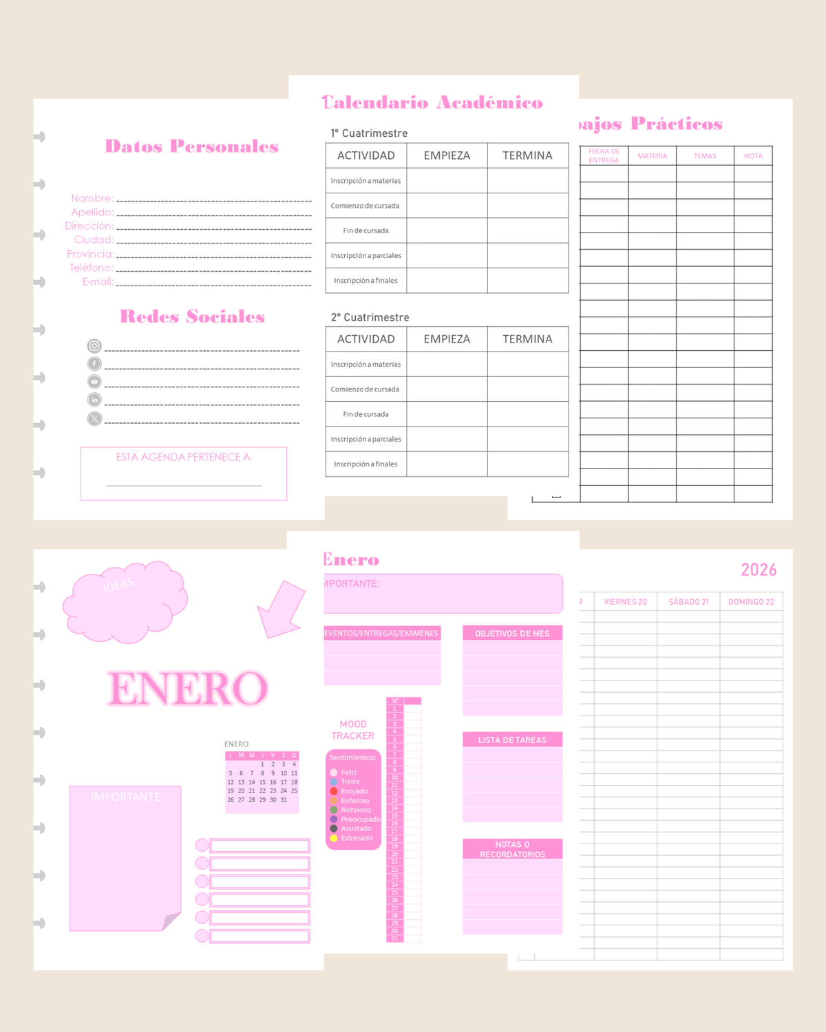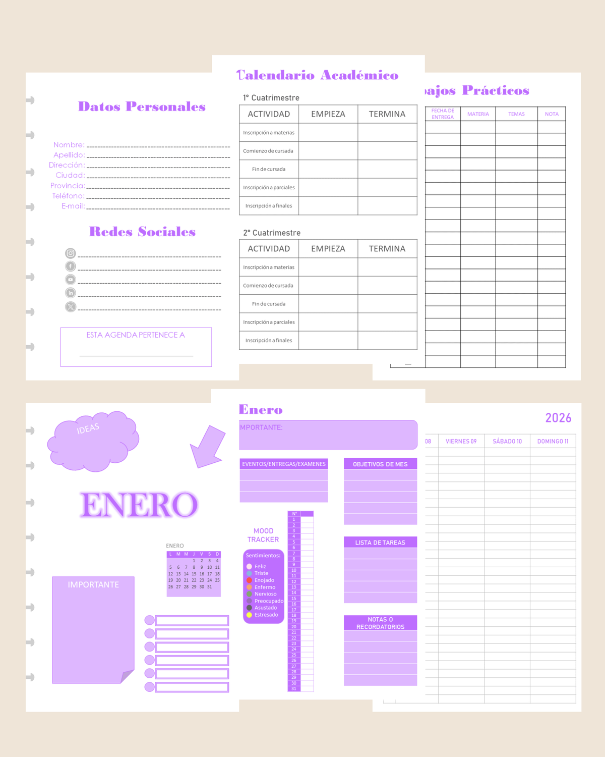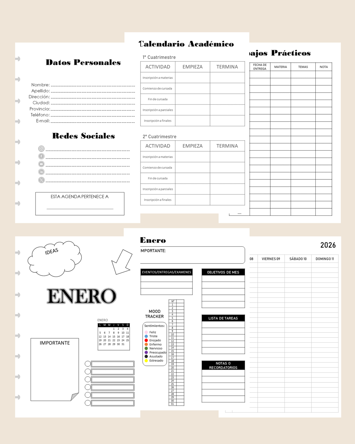 - Mood Tracker, Eventos / Entregas / Exámenes, Objetivos de mes, Lista de Tareas, Notas o Recordatorios