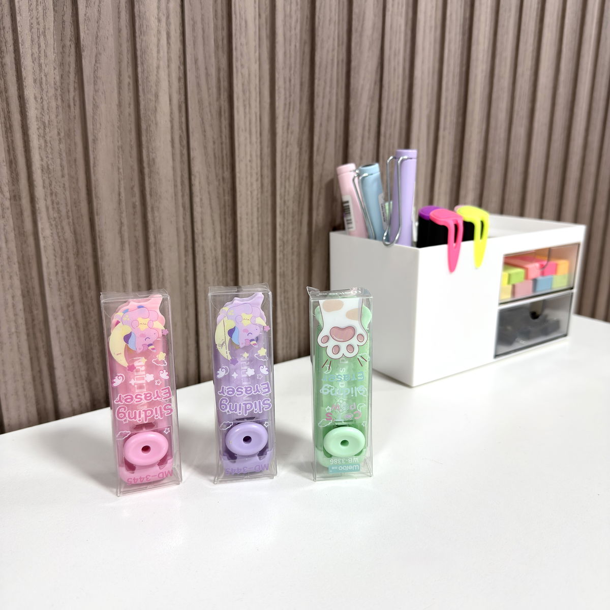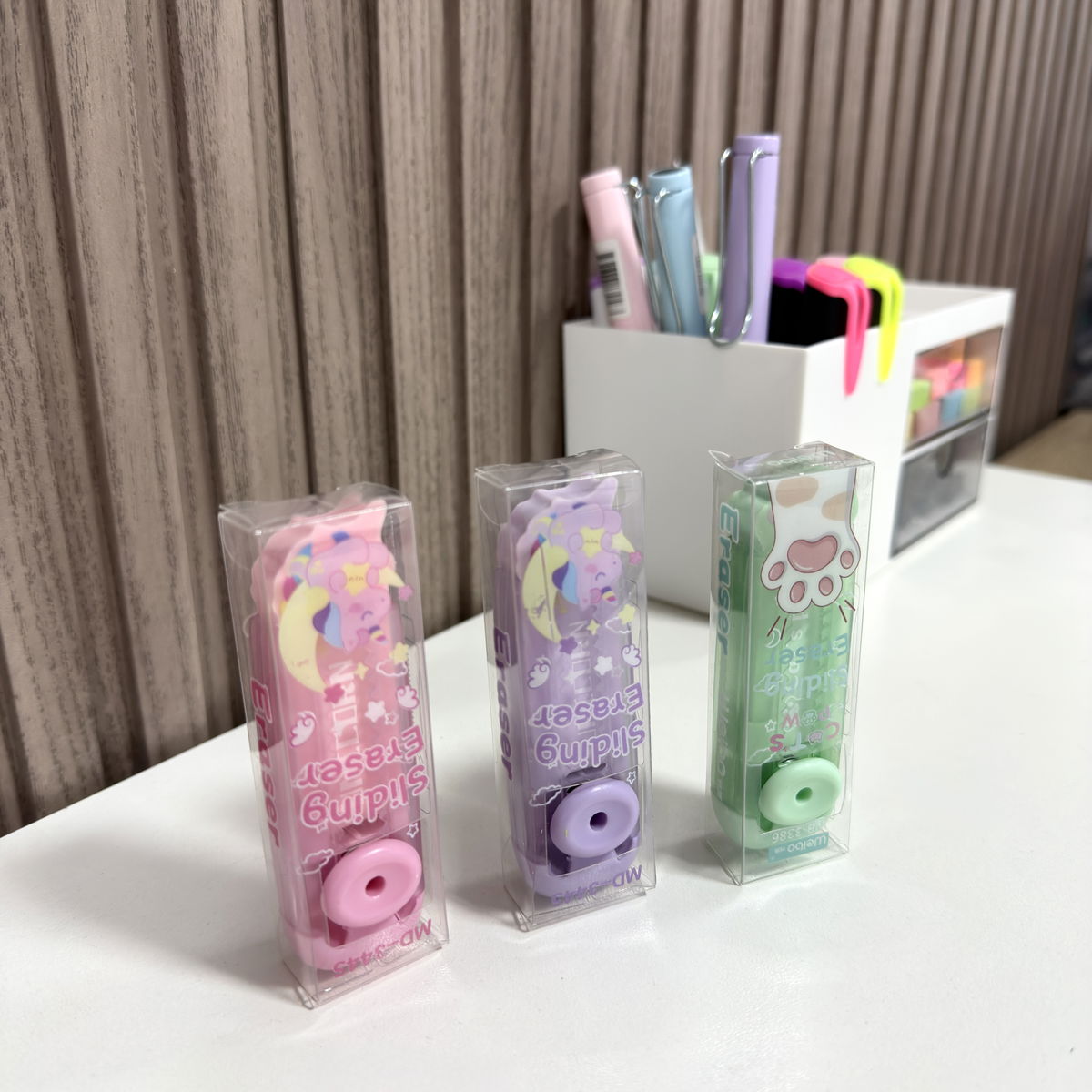 ✨Goma retráctil en colores rosa, violeta y verde, con forma de dibujo. Práctica y fácil de usar.
