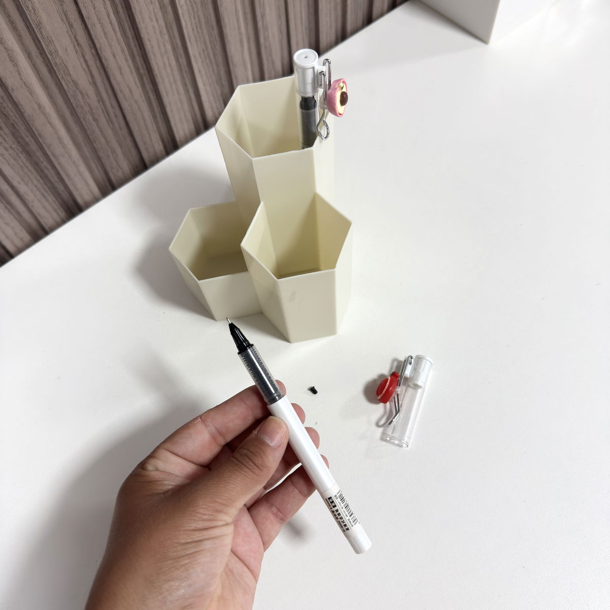 ✨Bolígrafo negro con detalle divertido en la tapa, combina funcionalidad y diseño.